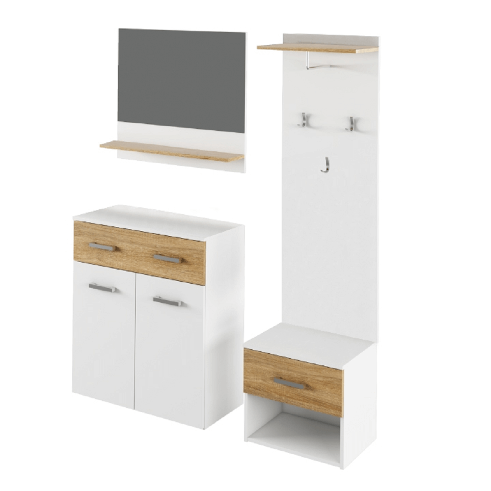 Moderná predsieňová zostava SIMA. Vyrobená je z kvalitného materiálu DTD laminovaná vo farebnom prevedení biela/dub sonoma. Predsieňová zostava sa skladá z vešiakového panela so šuplíkom, závesnej police a dvojdverovej skrinky so šuplíkom. Ponúka dostatok úložného priestoru vo forme šuplíkov, háčikov a políc.